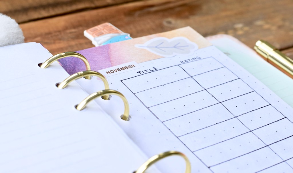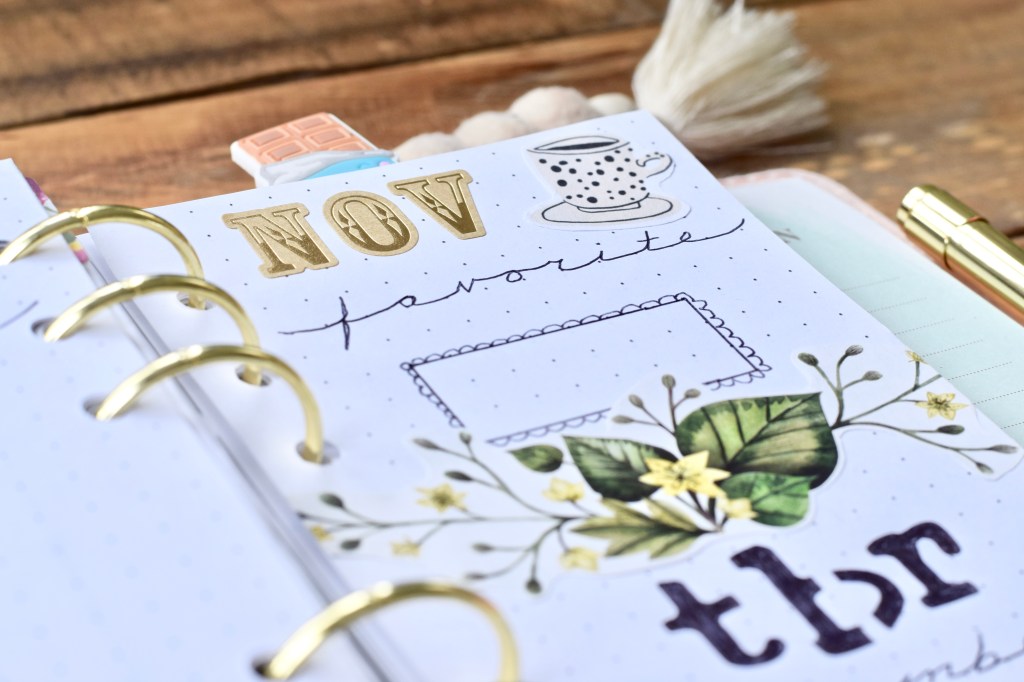 I printed out some dot grid paper so that it has the same effect as a bullet journal. At the beginning of the November section I’ve included a page for notes I’m taking on a book I plan on reviewing and on the right I can write down the books I am reading for the month and their rating out of 5 stars. I’ve added some decorations to add to it a little. I don’t know, it makes it a bit more exciting I think 🙂