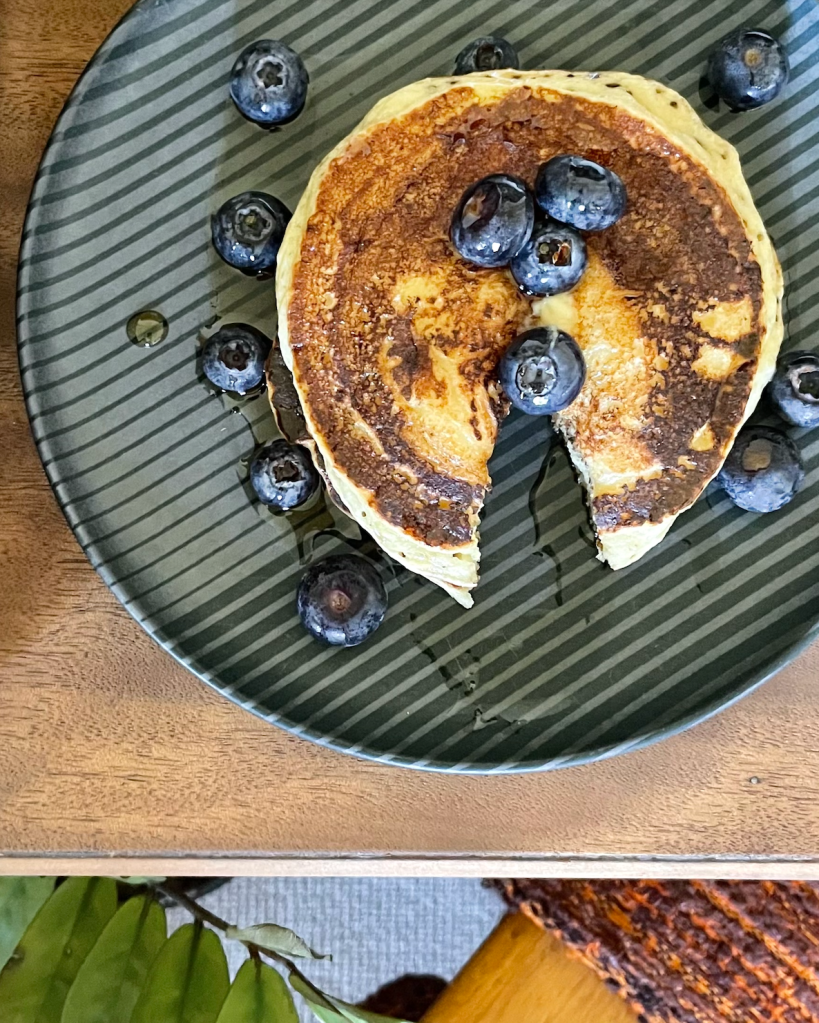 Perfect for those overripe bananas sitting on your kitchen bench-top! I had been saving a couple in the fridge with the intention of making some banana oat cookies, but I didn’t have all of the ingredients, and I just really wanted some pancakes that morning. These are easy to make and fluffy. Great topped with some blueberries and maple syrup.
